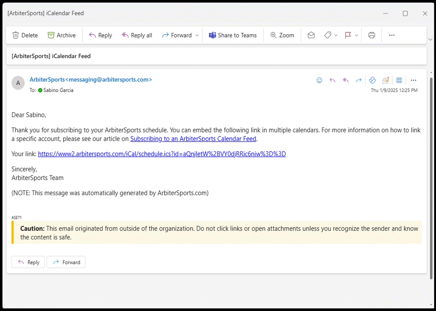 You will receive an email with the subject line "iCal Feed" from messaging@arbitersports.com. Within the email, copy the URL provided and paste it into the personal calendar you want to sync. Follow the instructions below for step-by-step guidance on syncing your calendars.